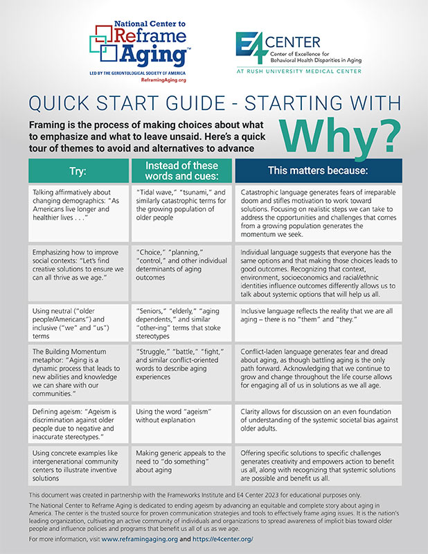 When Rush University sought funding from the Substance Abuse and Mental Health Services Administration (SAMHSA) in 2020 for the E4 Center of Excellence for Behavioral Health Disparities in Aging, they included principles to reframe aging as a strategy to address ageist language. That decision began a transformative change in how the E4 Center—with its focus to Engage, Educate, and Empower for Equity — and its many partners communicate about aging.